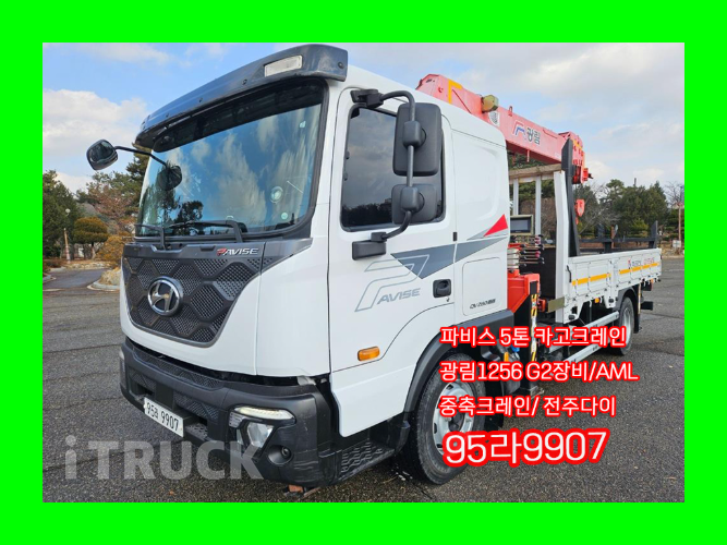 ▶ 95라9907 ◎ 차명 : 파비스 5톤 카고크레인 ◎ 년식 : 2022-03-31 ◎ 주행거리 : 7,968Km ◎ 옵션 : 광림1256 G2장비 / AML / 전주다이 / 중축크레인 ◎ 부가세는 별도입니다. ◎ 가격은 절충이 가능합니다. ======================================================== * 100% 실매물 차량이며 필요하신 사진이 있으시면 언제든지 보내드립니다. * 차량등록증, 성능점검기록부가 필요하시면 FAX로 보내드립니다. * 세금계산서 100% 발행해드립니다. (부가세 별도) * 차량 출고 후 1개월 혹은 주행거리 2000km 엔진/미션 보증 * 은 허위매물이 없습니다. * 합리적인 판매 금액과 친절한 상담 약속드립니다. * 화물차 매입 최고가 약속드립니다. * 항상 투명하고 안전한 거래로 다가가겠습니다.